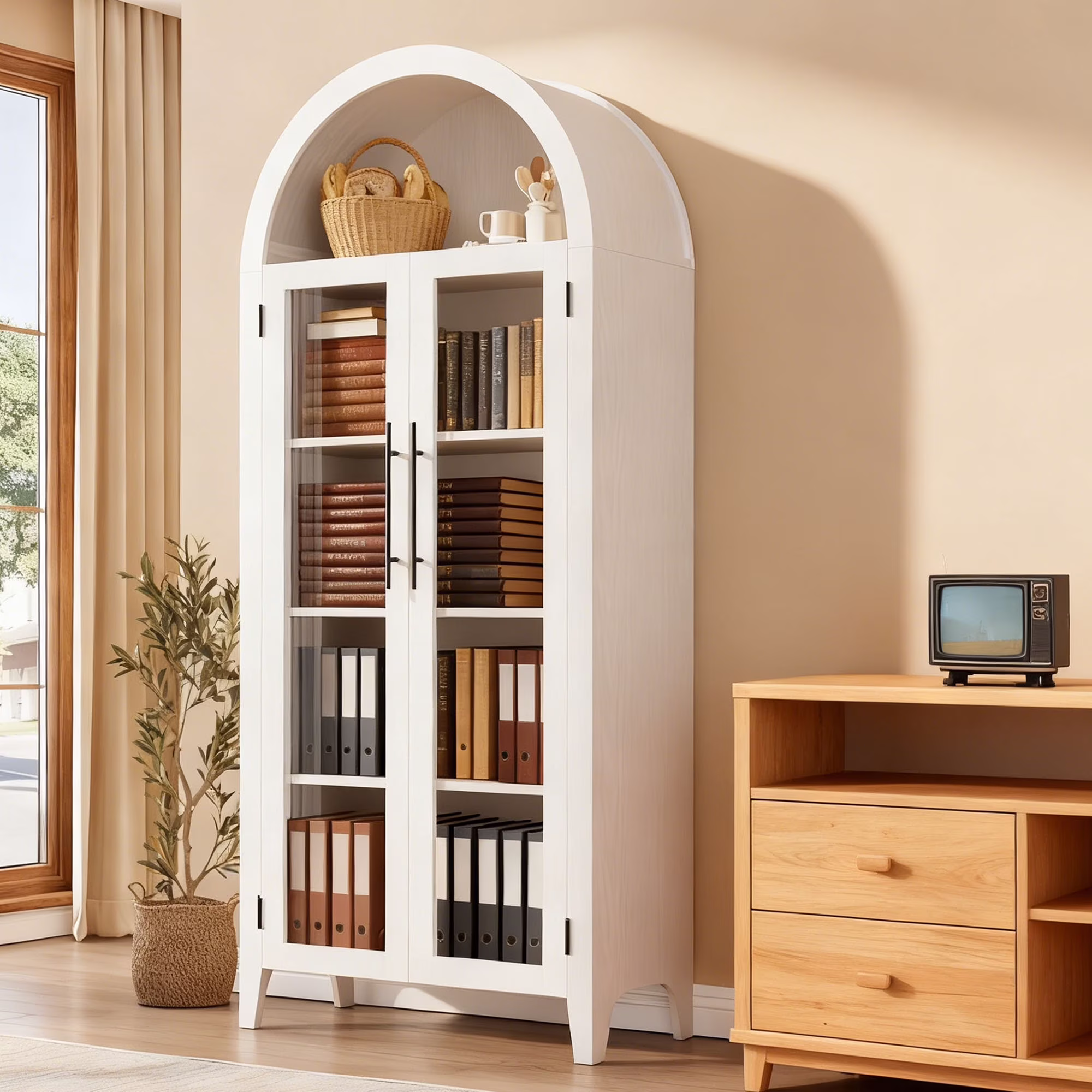 This elegant arched multi-functional storage cabinet elevates your home’s storage style. More than just a bookcase, it can also be a Kitchen Pantry Storage Cabinet. The stylish arched top and glass doors perfectly blend sophistication and practicality. The open design allows for easy access to and display of essentials, while adjustable shelves enable flexible storage of items of different sizes. Constructed from durable MDF and a sturdy base, the cabinet ensures longevity and stability. It’s ideal for the kitchen, living room, study, or any space that requires both beauty and functionality.